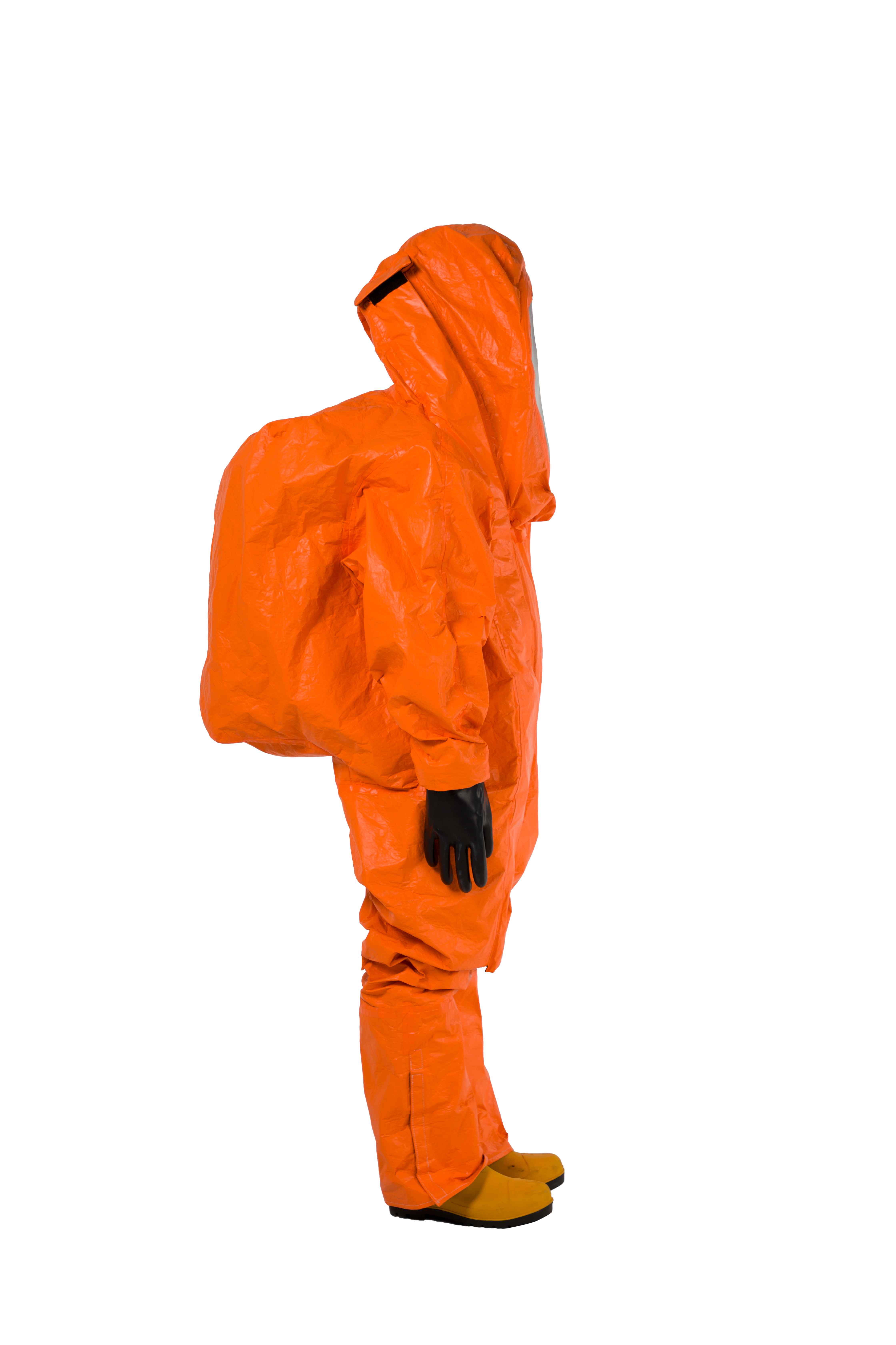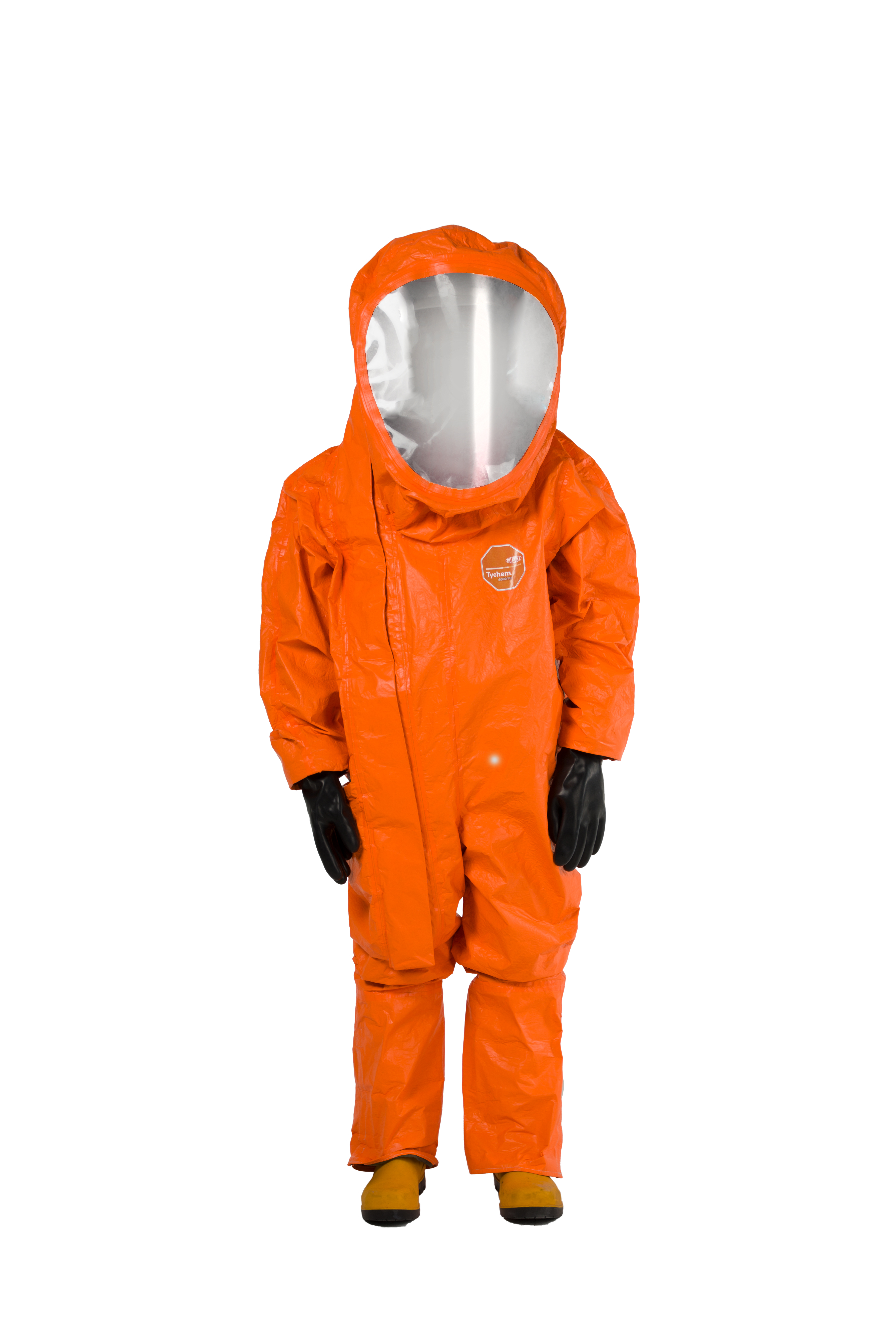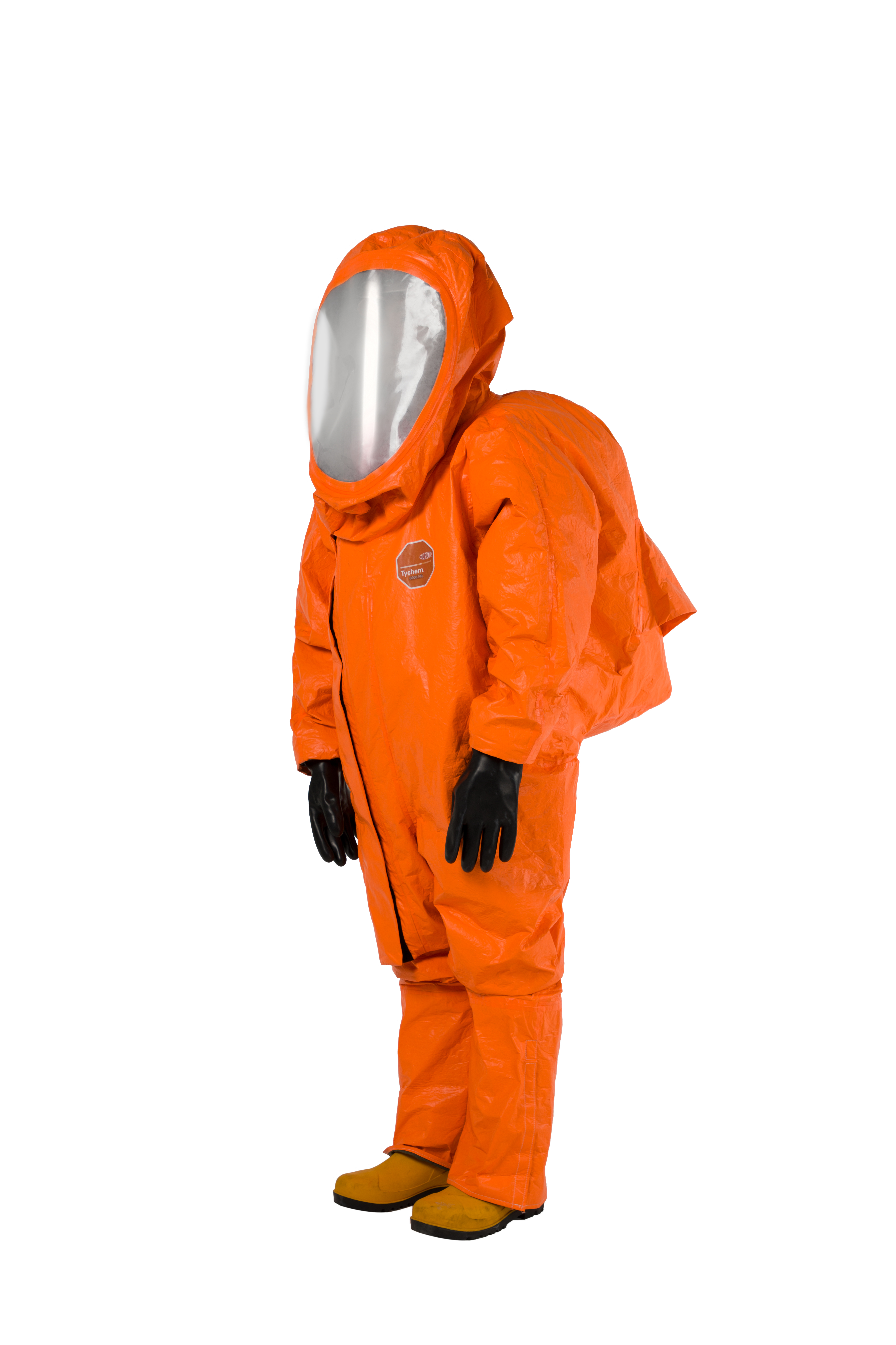 DuPont™ Tychem® 6000 FR, 모델 TP602T OR. 밀폐형 Level A. SCBA 공기호흡기와 함께 사용. 공기 호흡기 내부 착용을 위한 확장형 후면부, 전방 착의. 3중 안면창. 이중 장갑 및 장화 부착 일체형. 이중 지퍼 덮개, 벨크로 처리. 솔기 이중 테이핑 처리. 주황색.