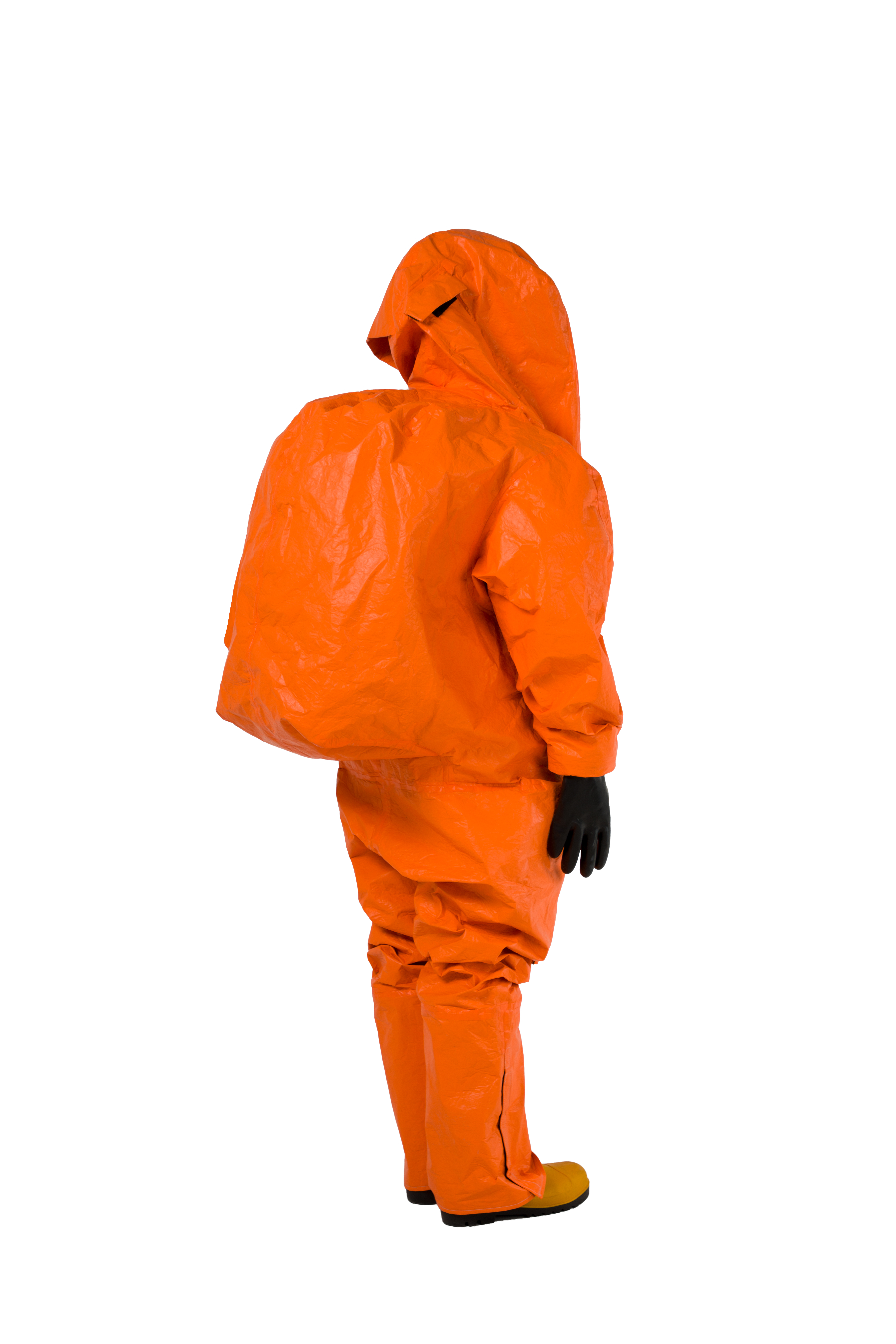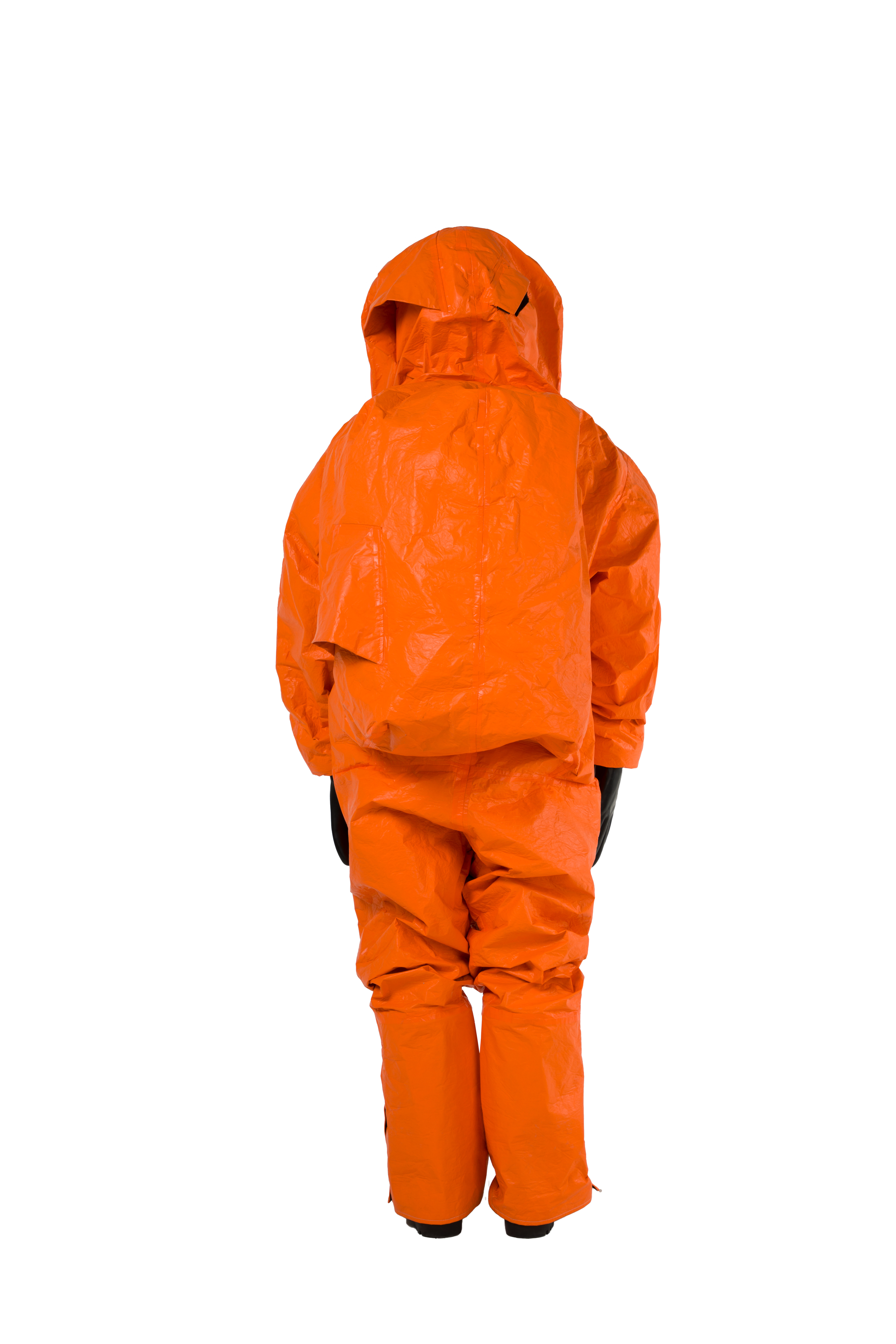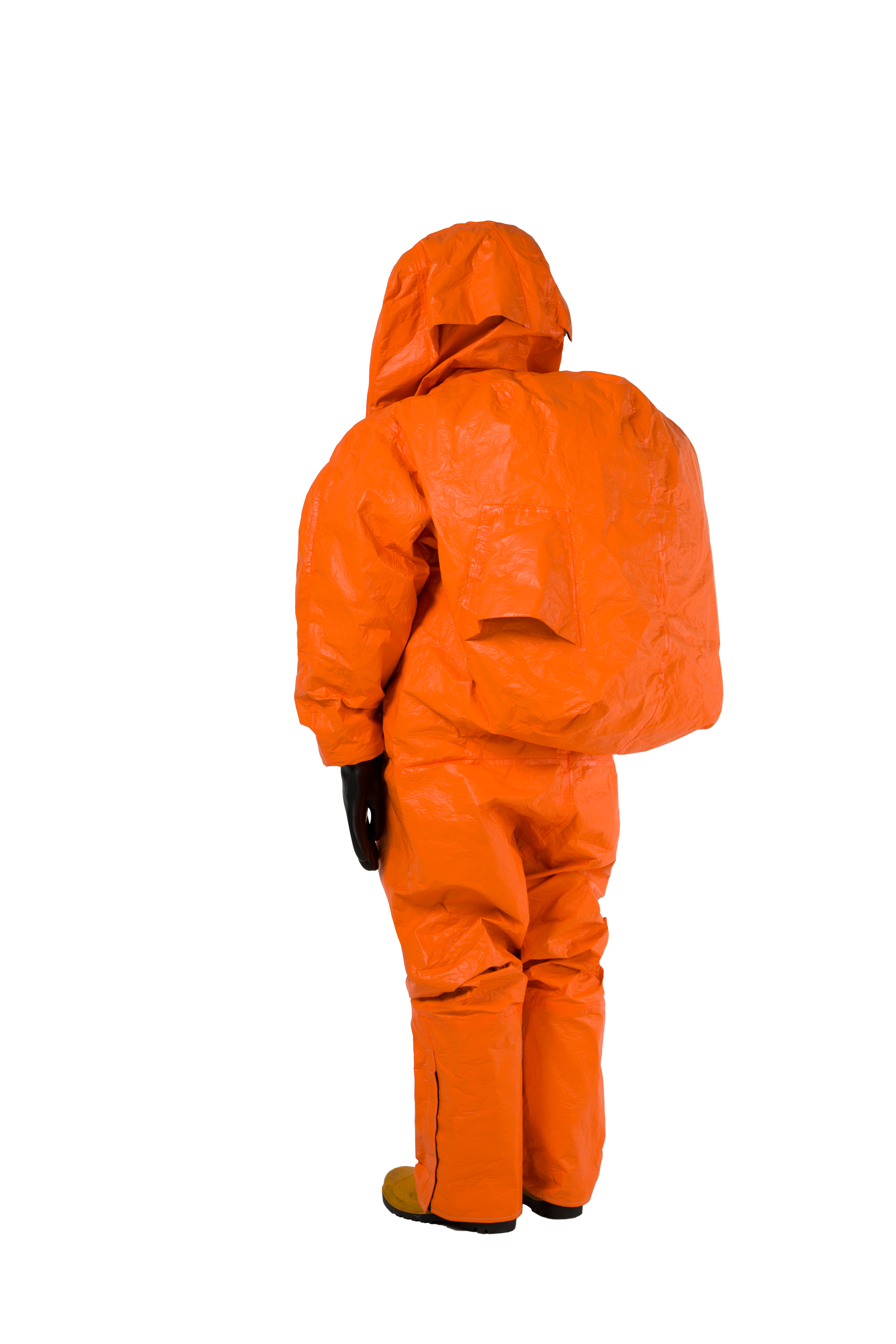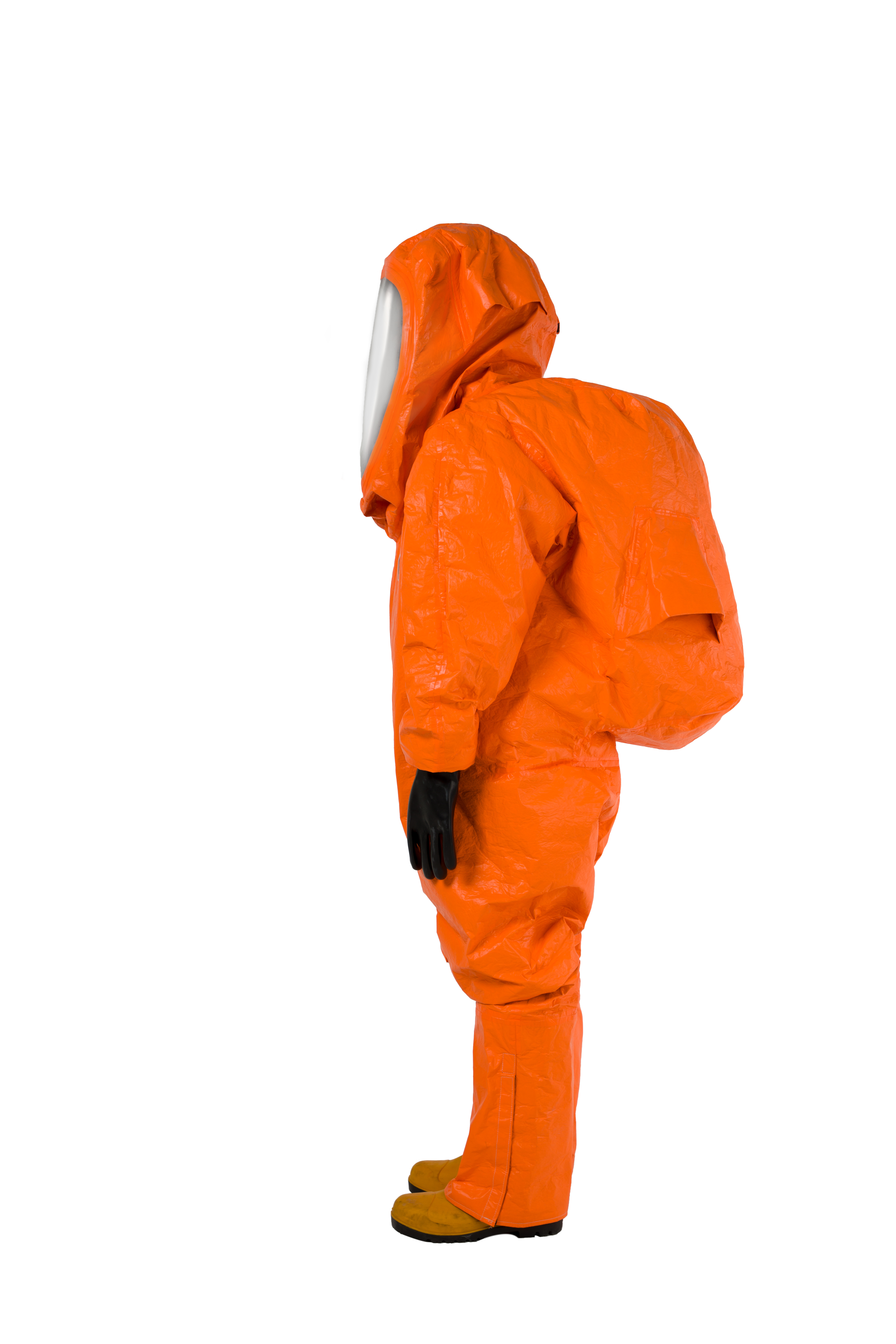 DuPont™ Tychem® 6000 FR, 모델 TP602T OR. 밀폐형 Level A. SCBA 공기호흡기와 함께 사용. 공기 호흡기 내부 착용을 위한 확장형 후면부, 전방 착의. 3중 안면창. 이중 장갑 및 장화 부착 일체형. 이중 지퍼 덮개, 벨크로 처리. 솔기 이중 테이핑 처리. 주황색.